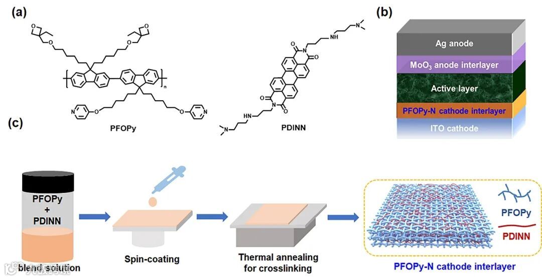 图1. (a) PFOPy和PDINN的化学结构,(b) 倒置器件结构示意图,(c) PFOPy-N阴极界面层制备示意图。