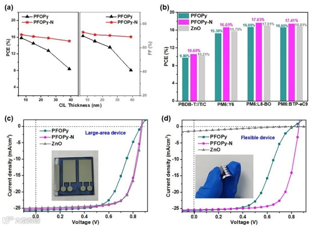 图2. (a) 器件的PCE、FF随阴极界面层膜厚的变化关系,(b) 基于不同活性层和阴极界面层的器件效率对比,(c) 大面积器件性能,和(d) 柔性器件性能。