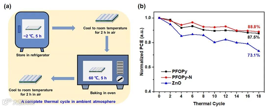 图3. (a) 在环境大气中2°C~60°C之间的热循环示意图,(b) 器件的归一化效率随热循环次数的变化关系。
