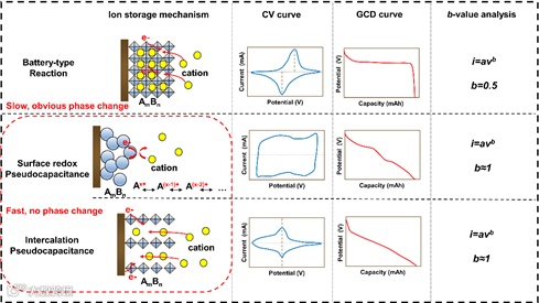 图2. 赝电容型材料与电池型材料的储能机理和特征。