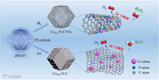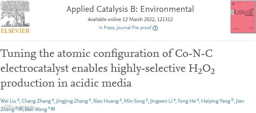 导读:该工作通过调控Co-N-C材料的结构和原子构型,成功实现氧还原反应从四电子途径切换到二电子途径用于酸性介质中高选择性电合成H2O2。