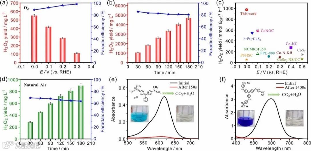 图6. CoSA-N-CNTs催化剂的H2O2产率以有机污染物降解测试。
