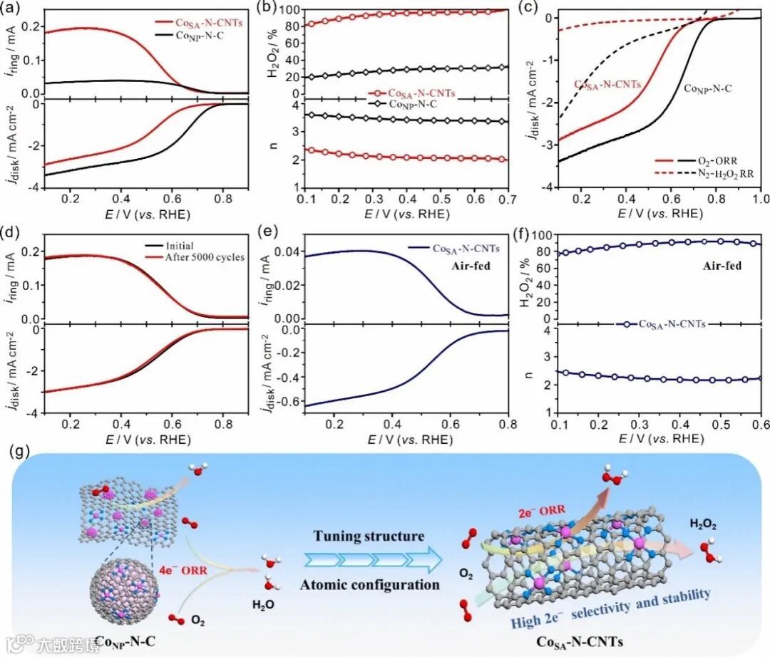 在酸性环境中的电化学测试结果(图4)表明CoNP-N-C催化剂表现出更高的活性,但是其更倾向于4eORR过程(过氧化氢选择性小于30%,转移电子数大于3.5)。相反,CoSA-N-CNTs催化剂具有出色的2e  ORR性能,在较宽的电压范围内具有超过95%的过氧化氢选择性,转移电子数无限接近于2,此外在循环加速衰老测试5000圈后其半波电位仅衰减1 mV,表明具有出色的2e选择性以及稳定性。