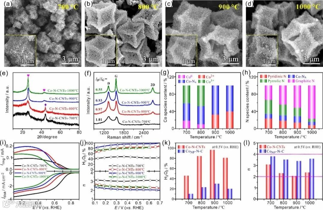 通过H2O2还原实验证明了CoSA-N-CNTs具有很低的H2O2还原活性,因此具有高的本征2e ORR选择性。通过调控热解温度(X=700-1000 ℃)制备了多种不同形貌和结构的Co-N-C材料(图5)。对比可得Co-N-CNTs-X催化剂相比于CoNP-N-CNTs-X均表现出更高的2e选择性。