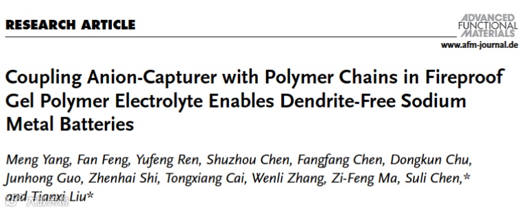 Coupling Anion-Capturer with Polymer Chains in Fireproof Gel Polymer Electrolyte Enables Dendrite-Free Sodium Metal Batteries.
