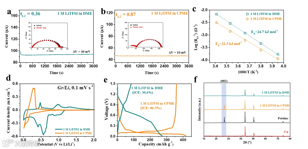 采用CPME作为溶剂的弱溶剂化电解液(1 M LiTFSI-CPME)可以有效提高锂离子迁移数(0.87),并降低脱溶剂化能垒,从而实现电解液与石墨负极的良好兼容性。相比于DME基电解液中石墨/Li半电池极低的容量发挥(82 mAh/g)和低的首次充放电库仑效率(30.6%),CPME基电解液可以使石墨负极发挥360 mAh/g的放电比容量和86.3%的首次充放电库仑效率。