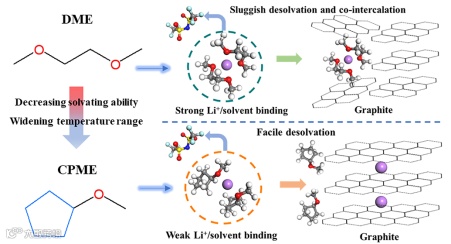 随着电力驱动的新能源汽车的快速发展和普及,对动力储能电池技术提出了更高的要求,下一代锂离子电池技术需要满足高功率快充和宽温度应用需求。然而,传统碳酸酯类电解液由于凝固点较高以及界面脱溶剂化行为较慢的限制,导致锂离子电池在快速充放电和低温条件下的容量表现不佳。相比之下,醚类溶剂具有更低的凝固点和低的粘度,被认为具有改善锂离子电池低温性能的潜力。不过,传统的醚类溶剂(例如乙二醇二甲醚DME)与锂离子间的结合能力很高,导致在充放电过程中难以实现快速的脱溶剂化过程。结果,这类醚类溶剂会和锂离子一起共嵌入到石墨层状结构中,从而破坏了石墨结构,难以有效应用于锂离子电池系统。