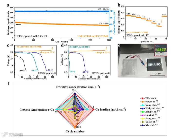 由于CPME溶剂介电常数(4.7)较低,使其作为单一溶剂时电解液的离子电导率较低(0.18 mS/cm),不利于电池性能发挥。为了进一步平衡电解液的离子电导率和脱溶剂化能力,采用高介电常数(78.4)且与锂离子结合能力较弱的FEC溶剂作为共溶剂,优化的电解液(1 M LiTFSI-FEC/CPME)具有较高的离子电导率(2.23 mS/cm)。采用该类弱溶剂化电解液也可以在石墨电极表面形成富含LiF等无机物的SEI膜,有效降低界面阻抗。最终,采用该类电解液的LFP/Gr软包电池可以展现出优秀的倍率性能和长期循环稳定性(1C倍率充放电循环1000次后容量保持率大于80%),且在-60℃低温下也具有良好的应用潜力。