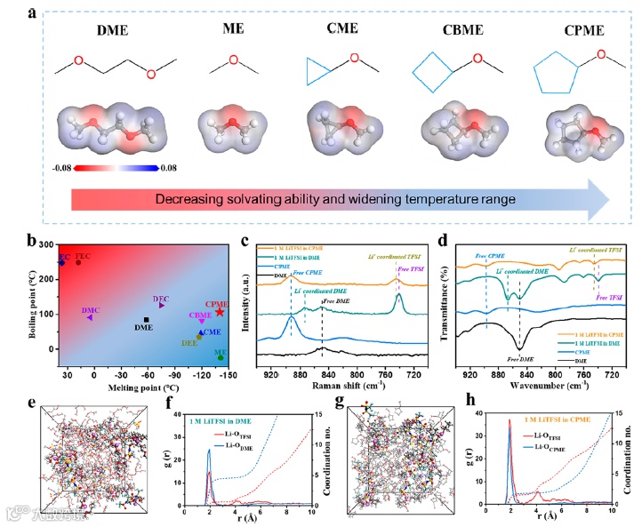 常规的醚类溶剂DME由于分子结构中双氧原子与锂离子会产生螯合作用,使其与锂离子结合能力强,难以在电极表面实现快速的脱溶剂化过程。采用含有单氧原子的链状醚类溶剂可以有效消除螯合作用,同时在链状醚类溶剂中引入大体积的环烃结构,可以提供较大的空间位阻,从而有效削弱溶剂与锂离子间的结合力。其中,含有五元环烃的CPME溶剂具有廉价易得和液程温度范围宽(-140~+106℃)的优势,有望应用于高性能锂离子电池体系。通过分子动力学模拟、DFT计算和光谱分析,发现CPME与锂离子的结合能力弱,有效促进更多的阴离子参与到锂离子溶剂化结构中。