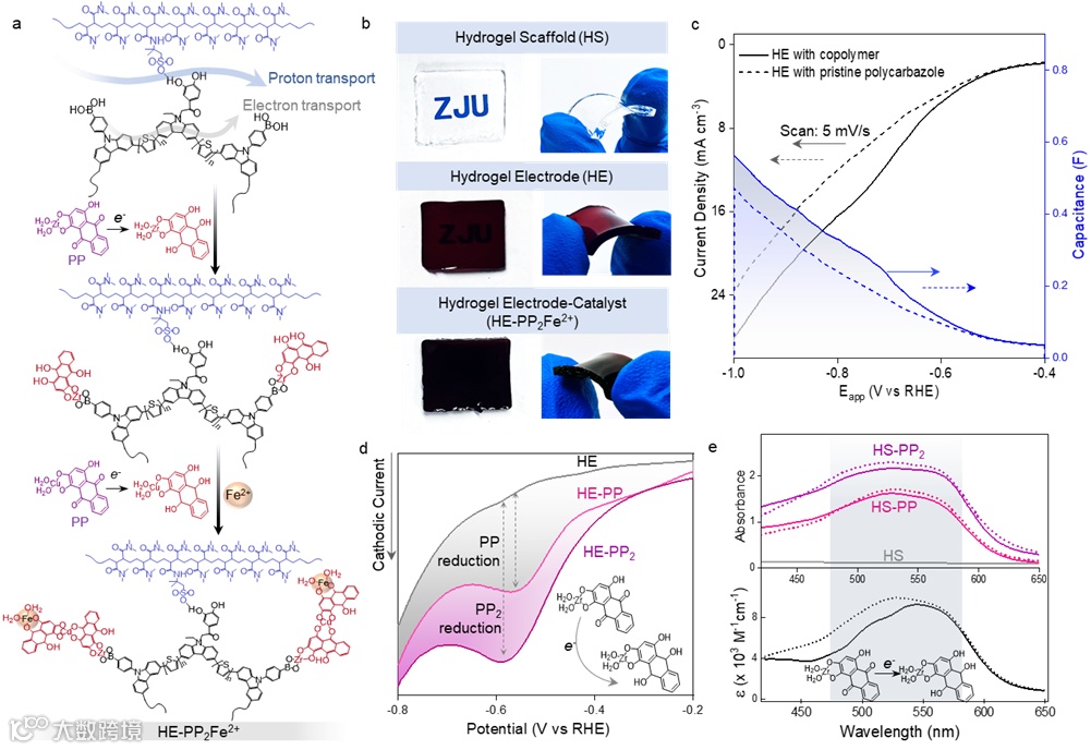 图2. 催化水凝胶电极的功能化。a,氧化还原引发的界面催化剂自组装合成。b,水凝胶基底(HS),水凝胶电极(HE)和催化剂功能化的HE(HE-PP2Fe2+)的光学图像。c,在pH 4.5电解质中以0.10 M苯醌为电子受体的共聚物(实线)和HE与原始聚咔唑(虚线)的HE的电化学响应。d,附着在HE上的-PP(粉红线)和-PP2(紫线)的电化学还原。HE的背景由虚线显示。e,PP官能化水凝胶薄膜的可见光吸收光谱(上图)和PP相应的消光系数(下图)。虚线和实线分别表示初始和双电子还原态的PP。