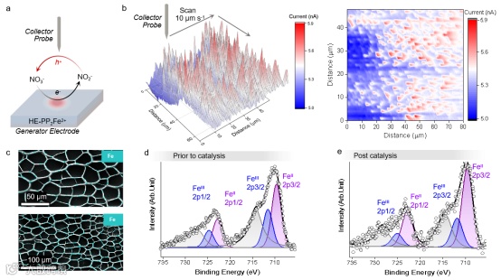 图5. 电化学绘图检测催化活性位点。a,扫描电化学显微镜(SECM)检测NO3-还原活性催化位点的示意图。b,扫描速率为 10 μm s-1 的情况下,在-0.53 V vs RHE对 HE-PP2Fe2+进行NO3-还原的催化活性位点的SECM图像映射。NO2-氧化的探针电位保持在1.07 V vs RHE。c,HE-PP2Fe2+中Fe的能量色散X射线(EDX)光谱。d,e,在 -0.78 V vs RHE 电催化 12 小时前(d)和后(e)的HE-PP2Fe2+的X射线光电子能谱(XPS)光谱。