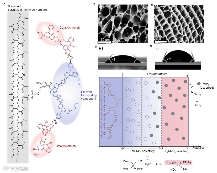 图1. 聚咔唑基电催化水凝胶电极。a,聚咔唑基水凝胶电极与自组装Fe催化剂的化学结构。b,c,冷冻干燥水凝胶基底(HS)(b)和水凝胶电极(HE)(c)的扫描电子显微镜显微照片。d,e,HS (d) 和 HE (e) 的接触角测量。f,聚咔唑基水凝胶电极电驱动疏水性变化示意图。