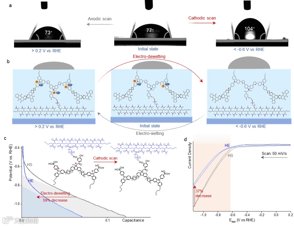 图4. 偏压控制的水凝胶电极亲疏水性变化。a,阳极(左)和阴极(右)扫描下HE的接触角测量。b,电位诱导的去湿行为的机理。c,在pH 4.5乙酸盐缓冲液中对HE(蓝线)和原始水凝胶(灰线)进行阴极扫描期间电容变化。d,阴极扫描下HE(蓝线)和原始水凝胶(灰线)的电流密度。