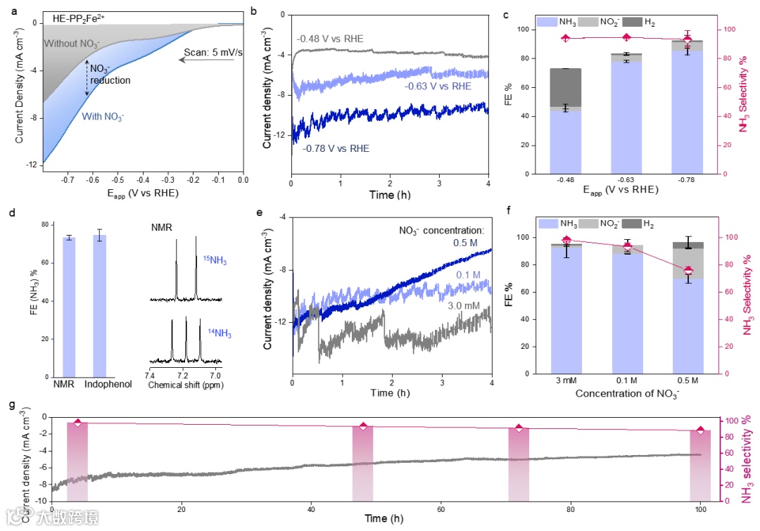 图3. 用水凝胶电极从硝酸盐中电合成氨。a,在存在(蓝色)和不存在(灰色)KNO3(0.10 M)的情况下,pH 4.5乙酸盐(0.10 M)缓冲液中HE-PP2Fe2+的极化曲线。b,c,HE-PP2Fe2+在不同偏差下,在KNO3(0.10 M)中的电催化电流密度 (b) 和效率 (c)。d,使用核磁共振(NMR)和靛酚显色法定量产物(左图)。右图显示了分别投入15NO3-和14NO3-产生的15NH3(上)和14NH3(下)的NMR波谱。e,f,HE-PP2Fe2+在不同KNO3 浓度电解液中的电催化电流密度(e)和效率(f)。g,使用HE-PP2Fe2+连续100小时将NO3-还原为NH3(施加电位:-0.78 V vs RHE; pH 4.5; NO3-(0.10 M))。