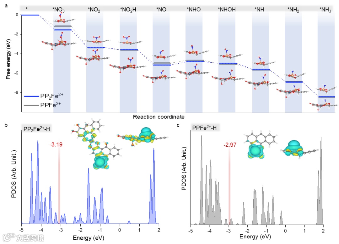 图6. NH3电合成的理论计算。a,-PP2Fe2+(蓝色)和-PPFe2+(灰色)在NO3-还原为NH3的过程中催化中间体的DFT能量势垒计算。b,c,-PP2Fe2+(b)和-PPFe2+(c)上吸附氢的状态投影密度(PDOS)图像。