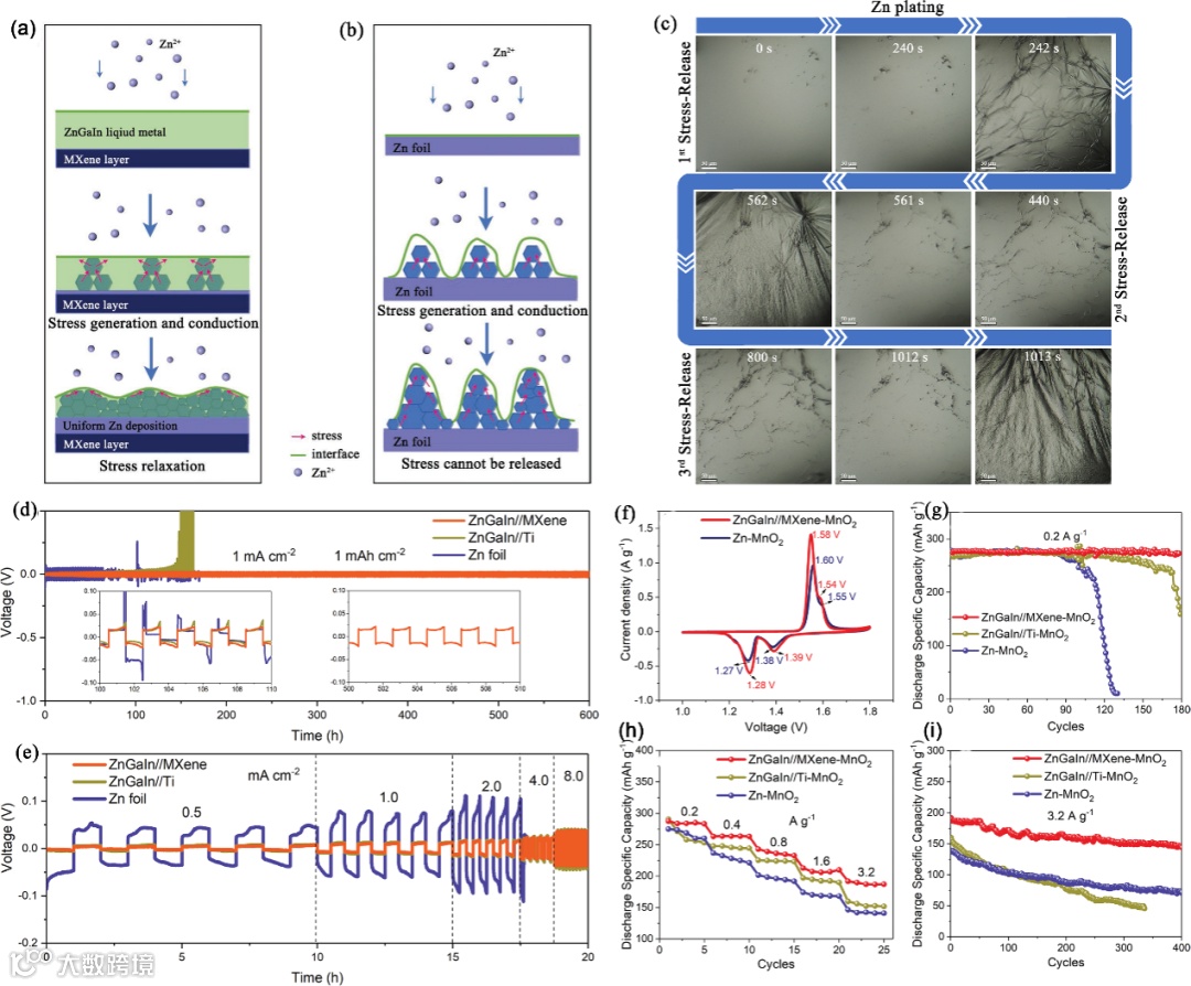 当然,应力释放策略可以与3D host或基底成核策略联合使用,发挥各自优势,相辅相成。如,顾佳男、杨树斌等提出采用MXene液态合金柔性复合薄膜用做金属Zn负极,实现了消除电沉积金属Zn过程中产生的应力的同时,也诱导了金属Zn的成核,区别于传统的金属Zn电沉积过程。(Adv. Energy Mater. 2022, 12, 2201181.)