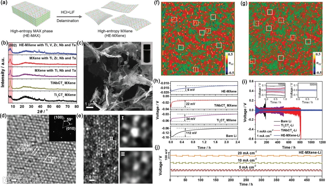 图3. HE-MXene的exx(f)和exy(g)应变分布图显示了强烈的应变,其中从绿色到深蓝色表示压缩应变程度,从红色到明亮黄色表示拉伸应变程度在数据栏中。