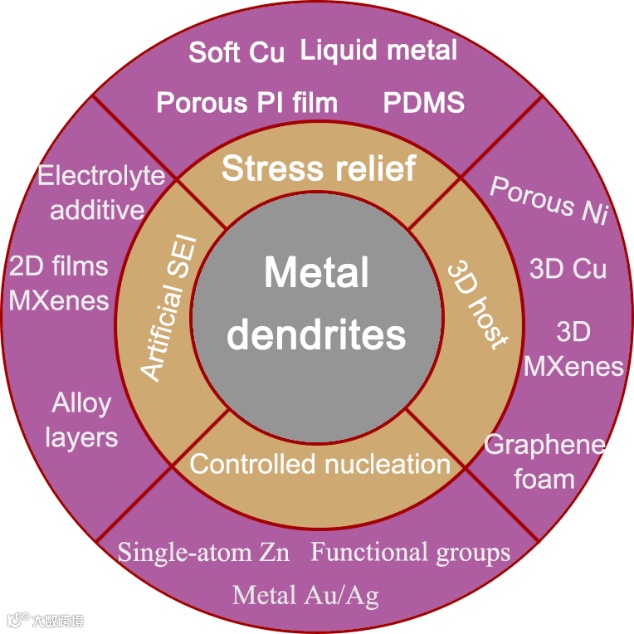 图1. 解决金属枝晶问题主要策略:可控成核,人工SEI,3D host以及应力释放。