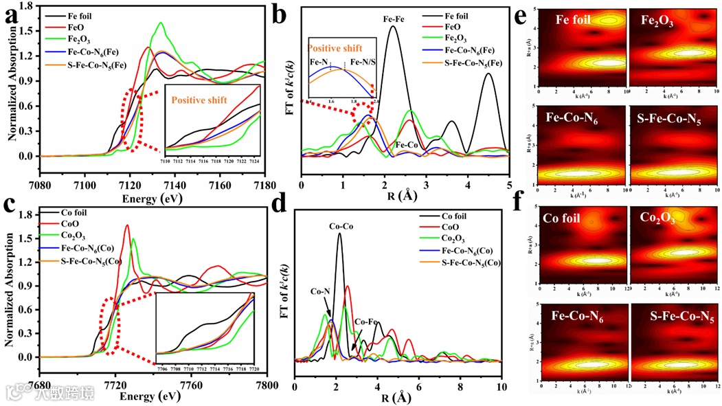 如图3a和c所示,结合Fe2O3、Fe箔、FeO、Co2O3、Co箔、CoO等材料中的相应原子信息。Fe-Co-N6和S-Fe-Co-N5中的Fe的吸收边能量位于图3a中所示的Fe和Fe2O3的值之间,表明Fe物种的氧化态介于0和+3之间。此外,从图3a和c的插图中可以看出,S元素的参与导致了Fe-Co-N6(Fe)的边缘结构向更高的束缚能量方向偏移。