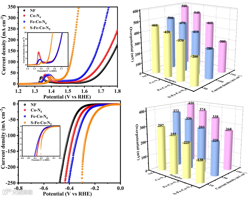 2. S-Fe-Co-N5表现出优异的OER和HER性能,它们在50 mA cm-2(OER)时过电位为260 mV,在10 mA cm-2(HER)时具有138 mV的过电位。此外,当催化剂被评估为双功能电极时,它还实现了持续20 h以上的1.55V的较低电池电压。