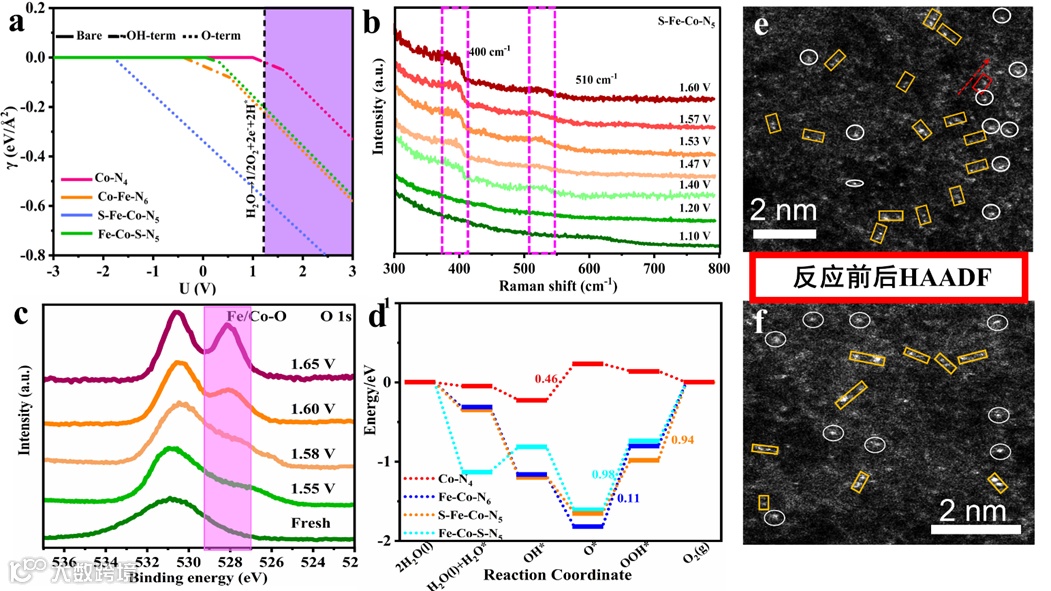 图 5. (a) Co-N4、Fe-Co-N6、S-Fe-Co-N5和Fe-Co-S-N5的活性中心相图。(b) S-Fe-Co-N5的原位拉曼光谱。(c) S-Fe-Co-N5的准原位XPS图谱。(d) Co-N4、Fe-Co-N6、S-Fe-Co-N5和Fe-Co-S-N5的OER反应结合能。(e,f)反应前后的双原子HAADF图像。