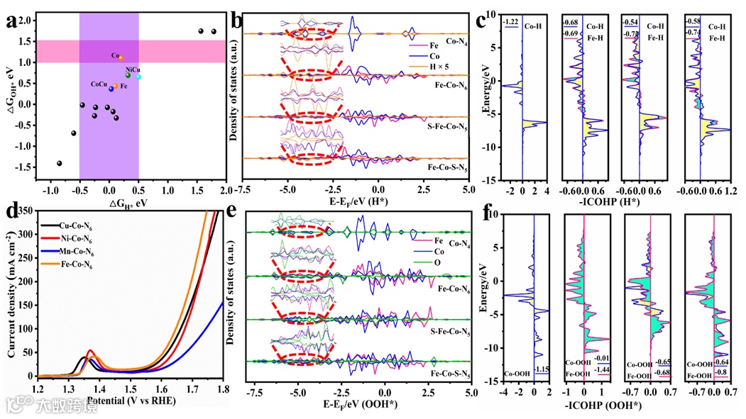 图1. (a)通过DFT计算获得的M-Co-N6的ΔGH*-ΔGOH*关系图。(d) OER反应中的电催化性能。(b,e) Co-N4、Fe-Co-N6、S-Fe-Co-N5和Fe-Co-S-N5的d带中心图。(c,f) 样品的COHP图。