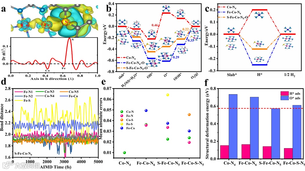 图6.(a) S-Fe-Co-N5构型沿b轴方向的微分电荷密度图和相关平面平均值。(b) 零电位(U=0)下OER中间体的自由能图,(c) HER中间体的自由能图。(d)还原电位下 S-Fe-Co-N5催化剂中的 AIMD 模拟Co-N、Co-S、Fe-Co和Fe-S距离。(e) Co-N4、Fe-Co-N6、S-Fe-Co-N5和Fe-Co-S-N5 的平均绝对误差图。(f) H*和O*吸附Co-N4、Fe-Co-N6、S-Fe-Co-N5和Fe-Co-S-N5的形变能。