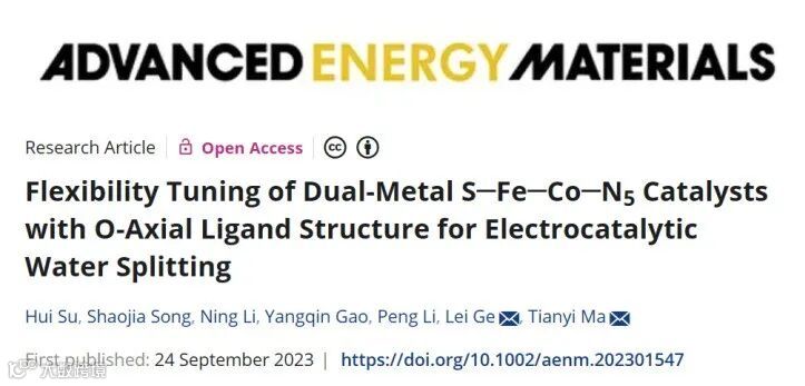 Hui Su, Shaojia Song, Ning Li, Yangqin Gao, Peng Li, Lei Ge, Tianyi Ma, Flexibility Tuning of Dual-Metal S-Fe-Co-N5 Catalysts with O-Axial Ligand Structure for Electrocatalytic Water Splitting Advanced Energy Materials 2023, 2301547.