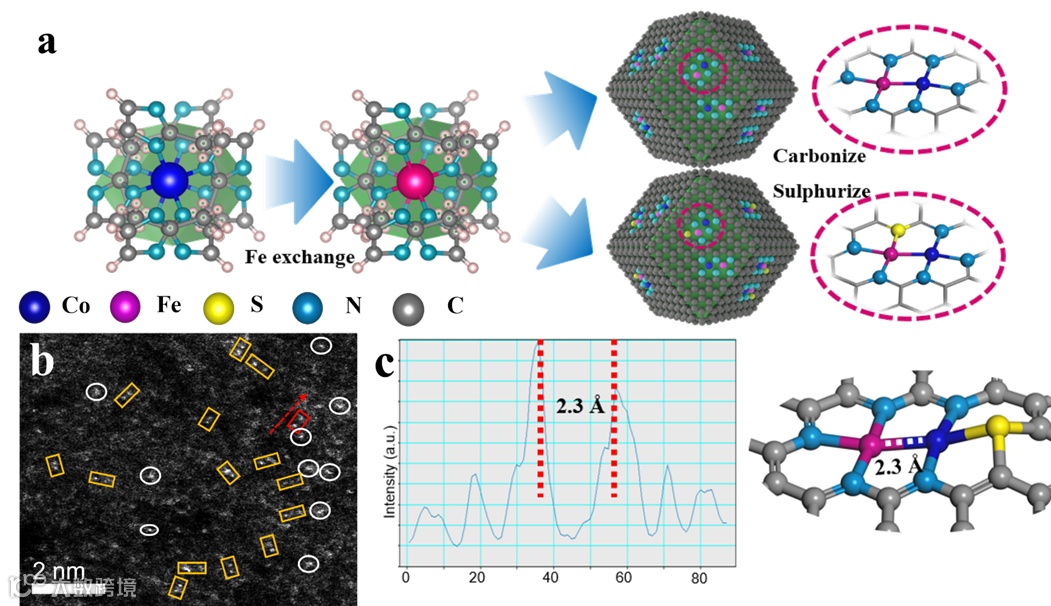 图2. S-Fe-Co-N5的制备过程示意图。(b) S-Fe-Co-N5的HAADF-STEM图像,其中方框和圆环分别用来标记双原子和原子位点。(c)沿红色箭头的红色框的线扫描轮廓。