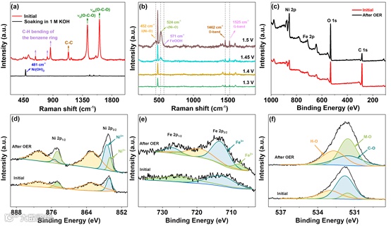 Ni3Fe-TPA首先浸泡到碱性电解质中时已经发生了结构的转变,原始结构中的有机配体被破坏,出现了更多的缺陷碳以及氧位点。随着外加电压的不断增大,Ni和Fe之间开始发生电子的转移,晶体结构再次重构,形成了新的Ni-O,Fe-O以及O-H。此外,根据文献中的报道,Ni与Fe的强耦合作用能够调节3d轨道的电子密度以及轨道填充,加速OH-的转移,进而增强OER催化性能。