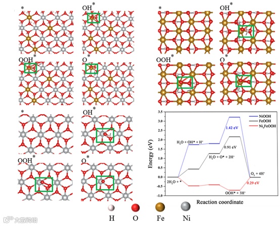 DFT计算显示,Ni3FeOOH的理论过电位远低于NiOOH和FeOOH。其中NiOOH和FeOOH的限速步骤是反应中间体OOH*的形成,而Ni3FeOOH的限速步骤是O2的释放。由于Ni和Fe的强偶联作用,Ni位点的3d轨道电子密度发生变化,eg轨道得到填充,有利于反应中间体的形成,进而提高OER催化性能。总体而言,Ni与Fe的协调作用以及Ni3FeOOH形成的氧缺陷空位均有利于提高OER催化活性。