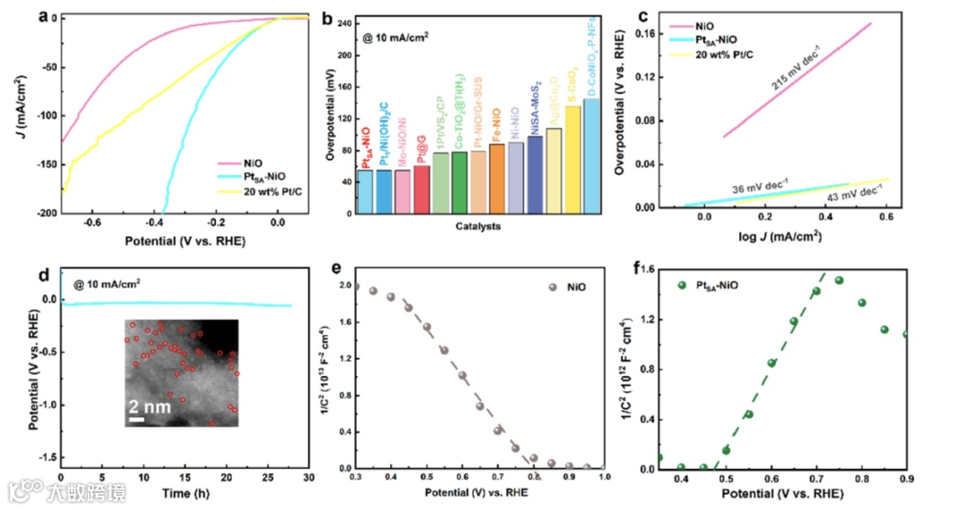 当n型PtSA-NiO用作HER阴极时,超薄纳米片上会发生自门现象,导致“活性”和“惰性”区域的混合。由离子门控和反向电势引起的“惰性”区域能够在超高电场下积累相对较高的表面电荷浓度,使得PtSA-NiO具有高导电性,同时,HER过程发生在Pt单原子位点(活性区域)。催化过程中电解质离子和表面带电中间体诱导的进一步一致的 Cint 表明,PtSA-NiO 电极在 HER 过程中具有稳定的自门控(图 5b)。此外,如图 5c 所示,PtSA-NiO的化学扩散的电子系数约为100 cm2 s-1,接近NiO的自由电子扩散系数。这意味着费米能级位于累积区(惰性区)导带深处,允许电子自由传输(无陷阱电荷转移),如图 5e 所示。而 NiO 电极的空穴化学扩散系数约为 10-4 cm2 s-1。因此,Pt单原子可以通过诱导 从p型到n 型半导体的转变,为电荷传输带来高导电表面。最后,图5d 表明,与 NiO 相比,PtSA-NiO加速的HER动力学,有利于 HER活性的增强。图5f显示了PtSA-NiO的反应过程。电子从泡沫镍转移到PtSA-NiO,并沿着PtSA-NiO的高导电表面转移,加速了HER过程。
