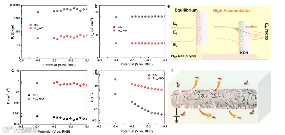 传输线模型(TL)是分析中间电荷传输不可忽视的一维或多孔膜电极的典型等效电路。我们获得的 NiO 样品在泡沫镍基底上垂直形成超薄纳米片,因此,通过该模型可以很好地描述其电化学过程。在不同电化学电位下测试NiO 和 PtSA-NiO 电极的EIS,通过EIS与TL模型拟合得到化学电容(Cint)、电荷传输电阻(Rt)和界面电荷传输电阻(Rct)等电化学参数。如图 5a 所示,NiO 和 PtSA-NiO 电极的R-t均表现出很强的电化学势依赖性。在 NiO 电极中观察到约 103 Ω cm 的Rt,这是半导体的典型导电特性。然而,在 Pt 沉积后,PtSA-NiO 的 Rt 降低至 10 Ω cm 的量级,这与金属电极相当。Rt的大幅降低归因于p 型半导体从NiO转变为PtSA-NiO。