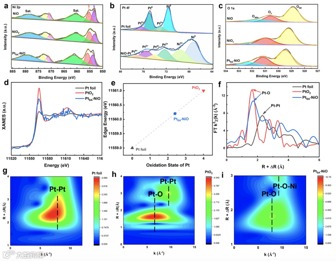 结合XAS, XPS等结果,验证了Pt单原子取代NiO结构中的部分Ni原子。与NiO和NiOv相比,PtSA-NiO的氧空位含量有所增加。这表明Pt的引入将导致更多氧空位的形成,从而进一步促进n型半导体特性。此外,由于结合能是相对于费米能级测量的,因此结合能的变化与样品费米能级的变化直接相关。如 XPS谱所示,PtSA-NiO 的 Ni 2p 和 O 1s 结合能的上升与费米能级向真空能级的移动一致。