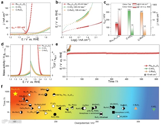 图3 Ru0.5 Ir0.5 O2电催化剂及参考样品| OER性能。a在经过iR校正(质量负载~ 283’μgcm−2)后,Ru0.5Ir0.5O2、C-IrO2和C-RuO2在O2饱和的0.5M H2SO4电解质中的OER极化曲线。b根据相应的LSV曲线计算0.5MH2SO4电解质中收集到的Ru0.5 Ir0.5 O2、C - IrO2和C - RuO2的Tafel图(a)。c不同催化剂在10 mAcm−2时的过电位和1.44 V与RHE下的电流密度的比较。d Ru0.5Ir0.5O2、C-IrO2和C-RuO2的质量活性和TOF。不同催化剂的计时电位测量值的比较。f各种已报道的电催化剂在酸性介质中10 mAcm−2下所需过电位和计时电位测定持久性的比较(补充表7)。