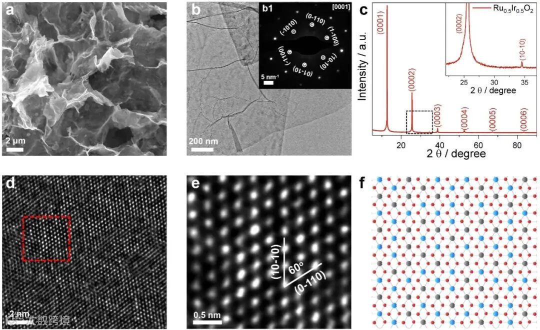 图1 | Ru0.5 Ir0.5 O2的结构和相表征。Ru0.5Ir0.5O2的SEM和TEM图像。b1 Ru0.5Ir0.5O2的SAED图案,其中六角形图案显示[0001]投影。c Ru0.5Ir0.5O2的XRD图谱。图中为Ru0.5Ir0.5O2的HAADF-STEM像差校正图像。f为Ru0.5Ir0.5O2的原子结构示意图,Ru、Ir、O原子分别用蓝色、灰色和红色的球体表示。