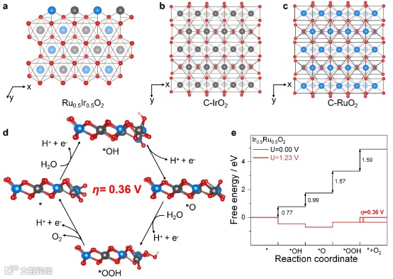 图5 Ru0.5 Ir0.5 O2 | DFT模拟结果。Ru0.5Ir0.5O2(−331.4 eV)的原子结构和Edft。C - IrO2 (b)和C - TuO2 (c)的原子结构(蓝色,Ru;灰色,Ir;d Ru0.5Ir0.5O2 OER机理示意图(蓝色,Ru;灰色,Ir;红色。
