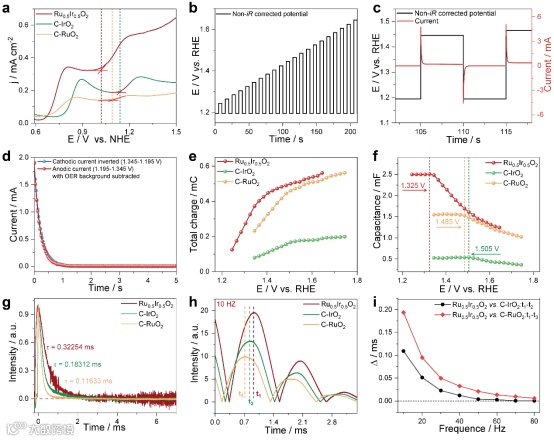 图4 |不同电催化剂的CV、PVC响应和TPV曲线。无水乙腈中Ru0.5 Ir0.5 O2、C-IrO2和C-RuO2的CV曲线。b PVC协议,在o2饱和的0.5M H2SO4电解液中,Ru0.5Ir0.5O2, C-IrO2和C-RuO2在1.195 V / RHE阴极电位和1.245 ~ 1.645V / RHE阳极非ir校正电位之间。c PVC方案(黑色),显示氧化还原和电流响应(红色)。d Ru0.5Ir0.5O2的阳极和倒阴极电流衰减。e Ru0.5Ir0.5O2, C-IrO2和C-RuO2的总电荷(积分阳极电荷)与PVC电位的关系。从聚氯乙烯的归一化阳极电荷到电位步进的扇形阳极电容。g Ru0.5Ir0.5O2、C-IrO2和C-RuO2的TPV曲线。h Ru0.5Ir0.5O2、C-IrO2和C-RuO2在10Hz下的强度-时间曲线。(t1、t2、t3分别为Ru0.5Ir0.5O2、C-IrO2、C-RuO2的峰值时间)。i不同频率(10、20、30、40、50、60、70、80Hz) Ru0.5 Ir0.5 O2与C-IrO2、C-RuO2峰值出现时间的比较。