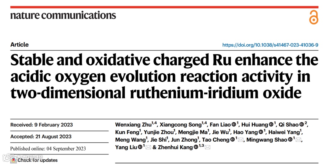 hu, W., Song, X., Liao, F. et al. Stable and oxidative charged Ru enhance the acidic oxygen evolution reaction activity in two-dimensional ruthenium-iridium oxide. Nat Commun 14, 5365 (2023).