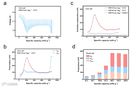 进一步地,作者采用恒电流间歇滴定技术(GITT)和电化学阻抗(EIS)联用的方法,对正极动力学进行解耦。实验数据表明在贫电解液和大倍率条件下,放电二平台初期电化学极化主导了电池总极化的增大与电池失效。