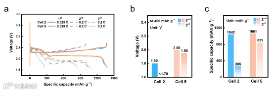 首先,作者探究了电解液用量对电池性能的影响。Cell 3采用与Cell 2相同的电芯和循环程序,不同的是Cell 3中的电解液用量充足。首圈0.025 C小倍率条件下,Cell 2和Cell 3电池性能接近。但切换至0.2 C后, Cell 3在二平台初期的极化显著减小,放电比容量未显著衰退。这表明在电解液量充足的情况下,锂硫软包电池在大倍率下可以正常循环。