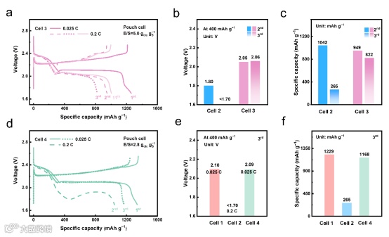 通过合理的电池参数设计,实现400 Wh kg−1级锂硫软包电池的成功装配。通过设置不同的循环条件,进一步探究电池在不同倍率下的性能差异。Cell 1在0.025 C下恒电流充放电循环,Cell 2在0.025 C下循环一圈后,切换至0.2 C下循环。实验数据显示,在0.2 C大倍率条件下,电池在放电二平台初期显示出巨大的极化,且存在放电比容量的显著衰减,这是电池在大倍率下性能衰退的主要特征。