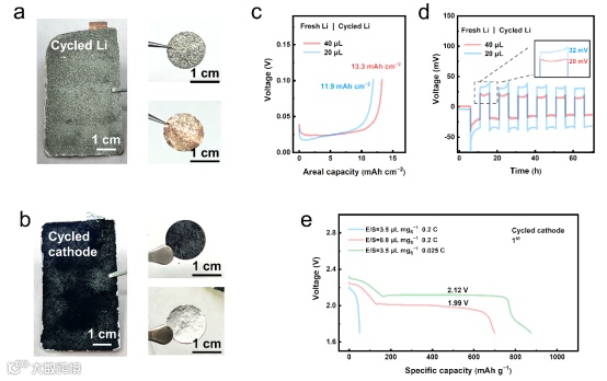 随后探究了测试倍率对电池性能的影响。Cell 4采用与Cell 2相同的电芯和电解液用量,不同的是,Cell 4在0.2 C循环一圈后切回至0.025 C循环。Cell 4在首圈0.025 C和第二圈0.2 C条件下循环时,均表现出与Cell 2相近的电池性能。虽然在大倍率下仍会出现二平台初期极化突增和放电比容量的衰减,但在随后切回小倍率后,Cell 4的电池极化和比容量均恢复至接近初始性能。这说明高能量密度锂硫软包电池在贫电解液和小倍率条件下可良好循环,大倍率循环对软包电池几乎没有不可逆损伤。通过对Cell 1-4的系统比较可知,大倍率和贫电解液的耦合导致电池性能迅速衰退,而非单一条件导致。