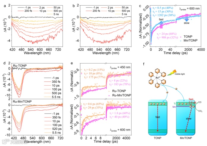 为了更加清晰的了解光生载流子提升的机理,精心设计了一组瞬态吸收实验。TONP和Mn/TONP均在600 nm左右有一个基态漂白峰,通过对漂白峰信号的动力学拟合可知,Mn/TONP在光激发后前期有着比TONP更快的载流子传递过程,但其整体的电荷复合动力学却明显比TONP慢。前期的超快电荷传递可归因于Mn位点对光生电子的快速捕获,因此阻碍了光生电子向价带的回落,导致了整体电荷复合被抑制。进一步的测试了真实反应体系的瞬态吸收光谱,发现Mn位点可显著提升光生电子从光敏剂到催化剂表面的转移。因此可知Mn位点可充当光生电子的快速提取和聚集位点,在促进光生载流子的转移和分离的同时形成局部电子富集区,有利于CO2还原的进行。