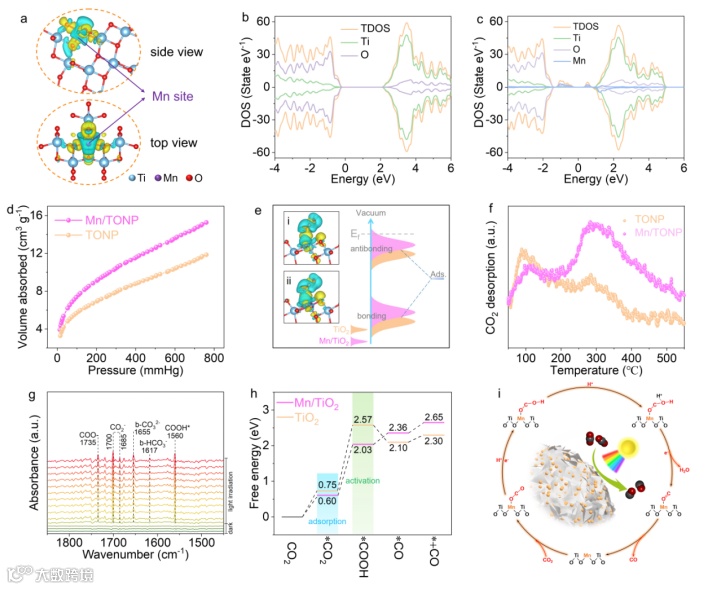 Figure 5. Investigation of the isolated Mn sites for photocatalytic CO2 reduction. (a) The differential charge density of Mn/TiO2. The calculated DOS of (b) TiO2 and (c) Mn/TiO2. (d) CO2 adsorption isotherms of TONP and MN/TONP. (e) The calculated differential charge density of CO2 molecule absorbed on i: TiO2 and ii: Mn/TiO2, and corresponding schematic illustration of bond formation between the catalyst surface and the adsorbate. (f) CO2-TPD measurements of TONP and Mn/TONP. (g) In situ DRIFTS spectra for CO2 photoreduction over Mn/TONP. (h) The calculated free energy diagrams for the conversion of CO2 into CO on TiO2 and Mn/TiO2. (i) The proposed photocatalytic mechanism for CO2 reduction to CO on the Mn site of Mn/TONP.