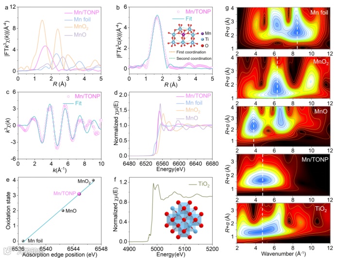 Figure 2. Characterization of Mn/TONP. (a) Mn K-edge Fourier-transformed EXAFS spectra of Mn/TONP, Mn foil, MnO2 and MnO. Fitting of the Mn K-edge EXAFS data in R space (b) and K space (c) for Mn/TONP. (d) K-edge XANES experimental spectra and (e) the linear combination fitting for the position of absorption edges of Mn/TONP, Mn foil. MnO2 and MnO. (f) K-edge XANES experimental spectrum of pure anatase TiO2. (g) WT for the k3-weighted EXAFS signal of Mn/TONP, Mn foil, MnO2, MnO and TiO2.