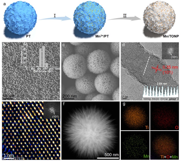 Figure 1. Synthesis and structure properties of Mn/TONP. (a) Schematic of the synthetic process for the Mn/TONP hybrid: (Ⅰ) decoration of Mn species and (Ⅱ) pyrolysis progress. (b, c) SEM images, (d, e) HRTEM images and (f, g) EDS mapping of Mn/TONP.