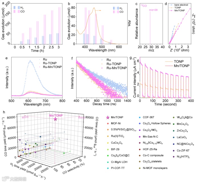 Figure 3. Photocatalytic performance and excitation properties of Mn/TONP. (a) Time-dependent CO and H2 evolution of Mn/TONP. (b) Wavelength-dependent gas generation rates of Mn/TONP and the light absorption spectrum of the Ru photosensitizer. (c) GC-MS analysis for CO produced from 13CO2 isotope experiment. (d) EIS curves of TONP and Mn/TONP. (e) PL spectra and (f) TRPL spectra of reaction system with TONP or Mn/TONP. (g) Transient photocurrent responses for TONP and Mn/TONP. (h) Comparison of the photocatalytic activity for CO2 reduction over Mn/TONP with other photocatalysts.