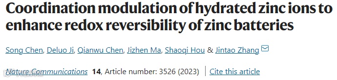 其成果以题为“Coordination modulation of hydrated zinc ions to enhance redox reversibility of zinc batteries”在国际知名期刊 Nature Communications上发表。