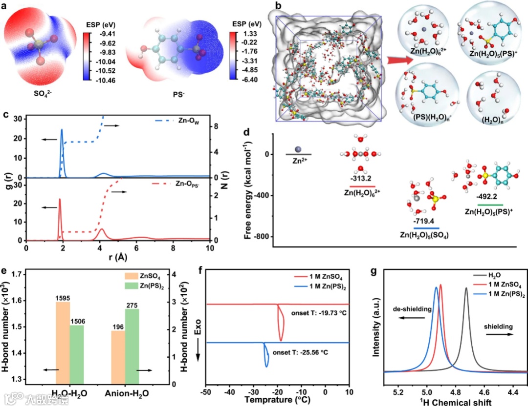 图3. (a)SO42-和PS-静电势图。(b)1 M Zn(PS)2分子动力学模拟电解液结构图。(c)Zn-Ow和Zn-Oanion径向分布函数和配位数。(d)Zn(H2O)5(SO4)和Zn(H2O)5(PS)+脱溶剂化能。(e)分子动力学模拟电解液中的氢键数目。(f)1 M ZnSO4和1 M Zn(PS)2 DSC测试。(g)H2O中的1H化学位移。